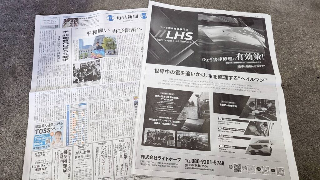 中部毎日新聞にて、当社の活動と専門性が掲載されました! 2025.06.22 メディア 中部毎日新聞にて、当社の雹害車修理事業および取り組みについて掲載されました。雹害車修理専門店として、全国各地で迅速かつ高品質な修理体制を構築してきた点や、地域に根ざした対応力についてご紹介いただいております。今後も、雹害によりお困りのお客様に安心と信頼をお届けできるよう、専門性の向上とサービス品質の追求に努めてまいります。
